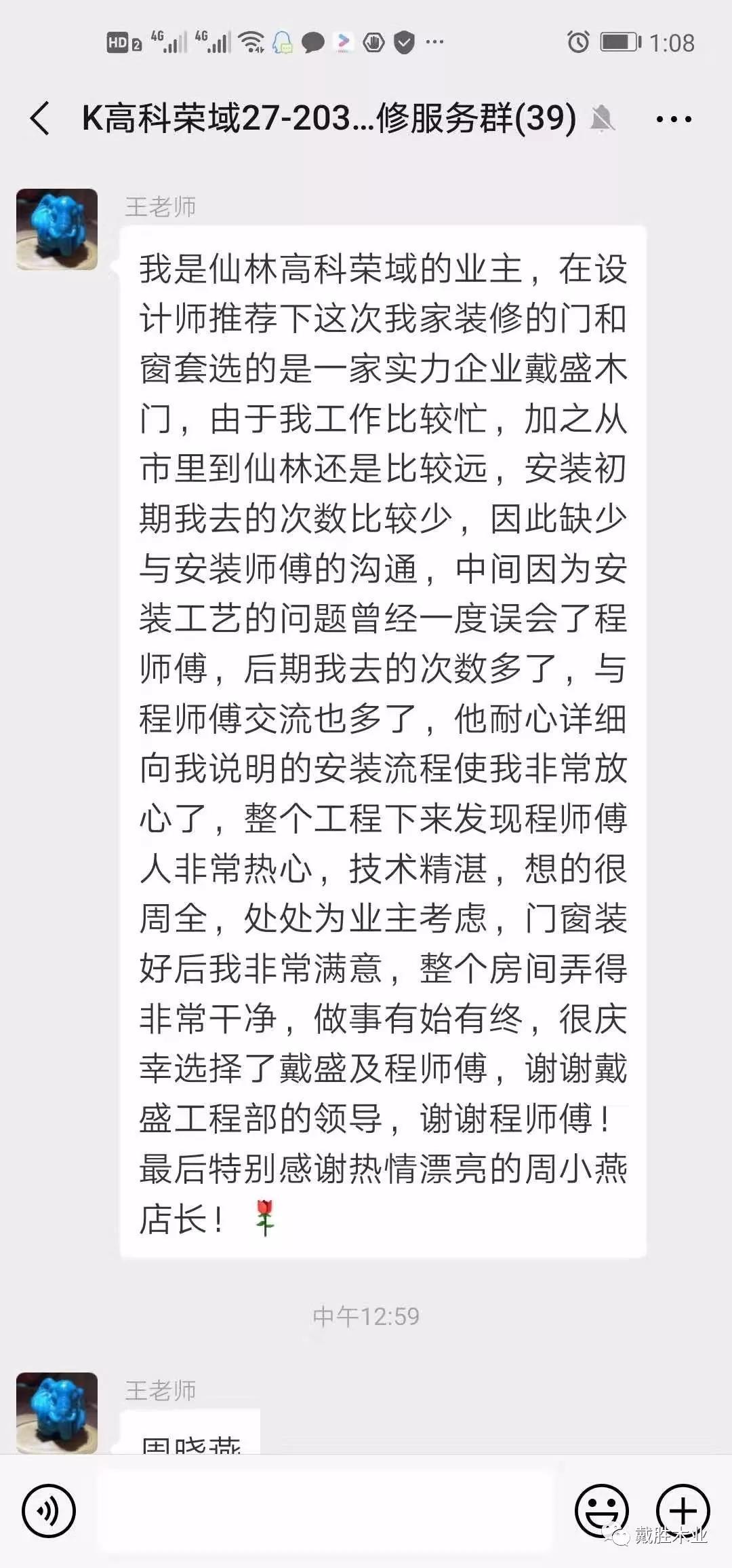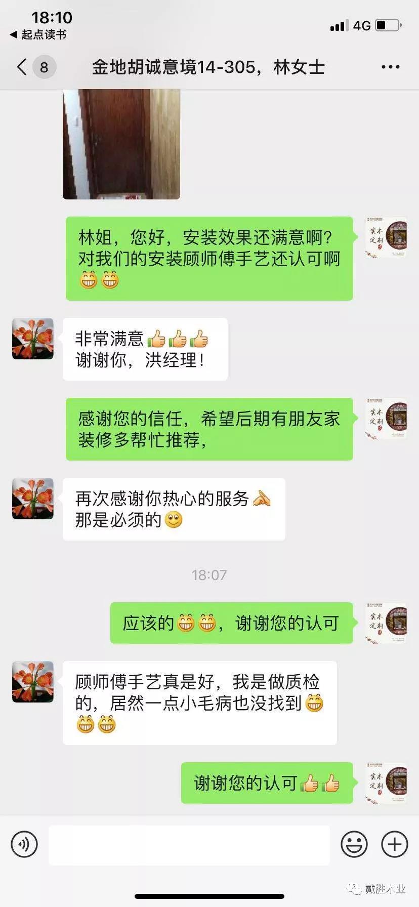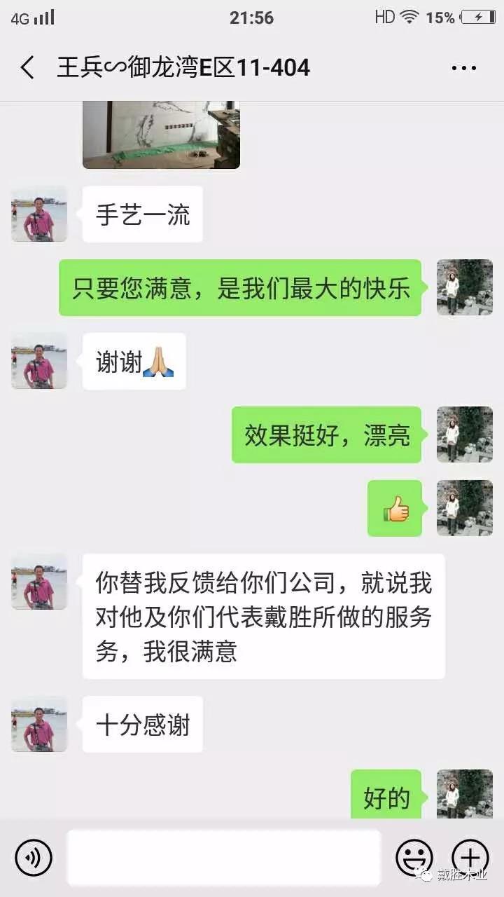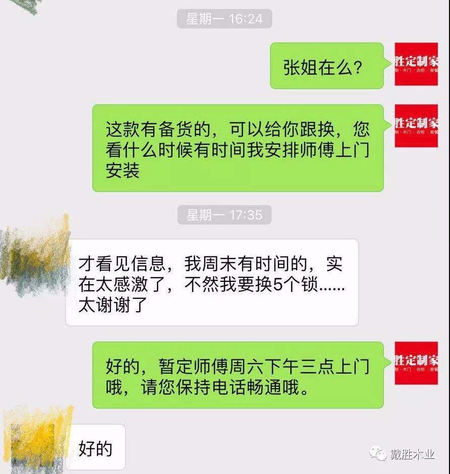 戴勝客服中心立刻安排“匠心服務(wù)團”為客戶(hù)解決難題,不僅如此,更幫客戶(hù)把家中所有木門(mén)、柜門(mén)都進(jìn)行了維護,得到客戶(hù)的高度評價(jià)。