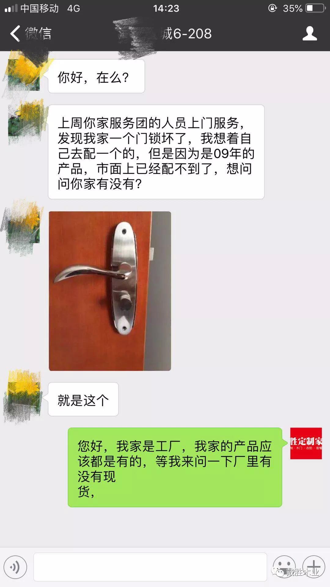 最近,戴勝客服中心接到了一個(gè)特殊的服務(wù)需求,該客戶(hù)在2009年選購了5套戴勝木門(mén)產(chǎn)品,使用了10年,在一次“戴勝匠心服務(wù)團”的日常維護中發(fā)現,其中一個(gè)門(mén)鎖壞了,多年前的產(chǎn)品,市面上已經(jīng)配不到了,于是客戶(hù)求助戴勝。