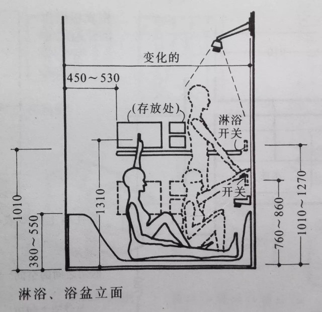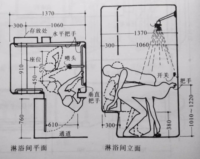 浴缸以及便池附近應設置尺度適宜的扶手,以方便老弱病人的使用。