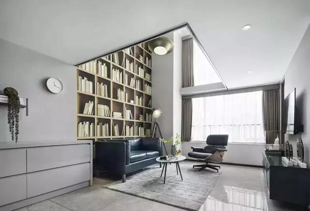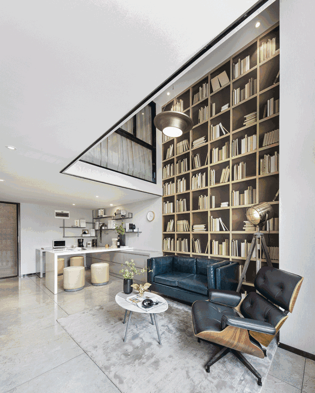 客廳挑高的背景墻使用書(shū)架壁紙裝飾,鈷藍色雙人沙發(fā)、黑色皮包躺椅、水紋精致大理石桌、仿古望遠鏡造型的落地燈,這些再日常不過(guò)的靜物、毫不鮮亮的色彩,在大面積自然光散射下,反而與外界的紛繁嘈雜隔絕開(kāi)來(lái),顯得高雅精致,于靜謐中彌散出震撼無(wú)比的恒久物感。