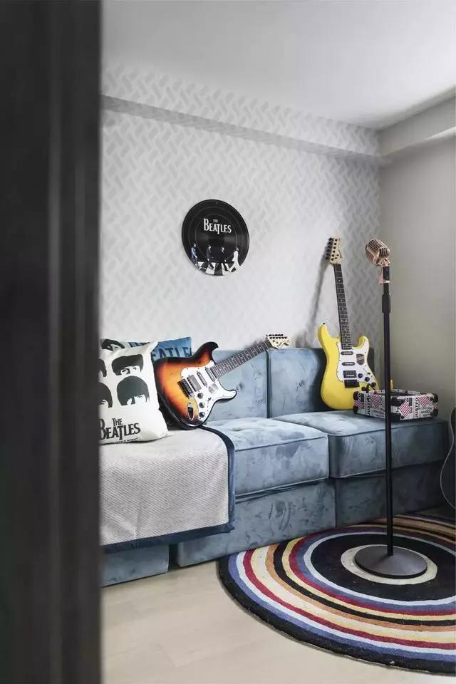 男孩房中寬大的沙發(fā)可以多種組合擺放,折疊成床墊,使空間更具張力。閑暇時(shí)分,陪伴孩子來(lái)一場(chǎng)小型輕搖滾演奏,向生活偷回一份不羈與隨意。