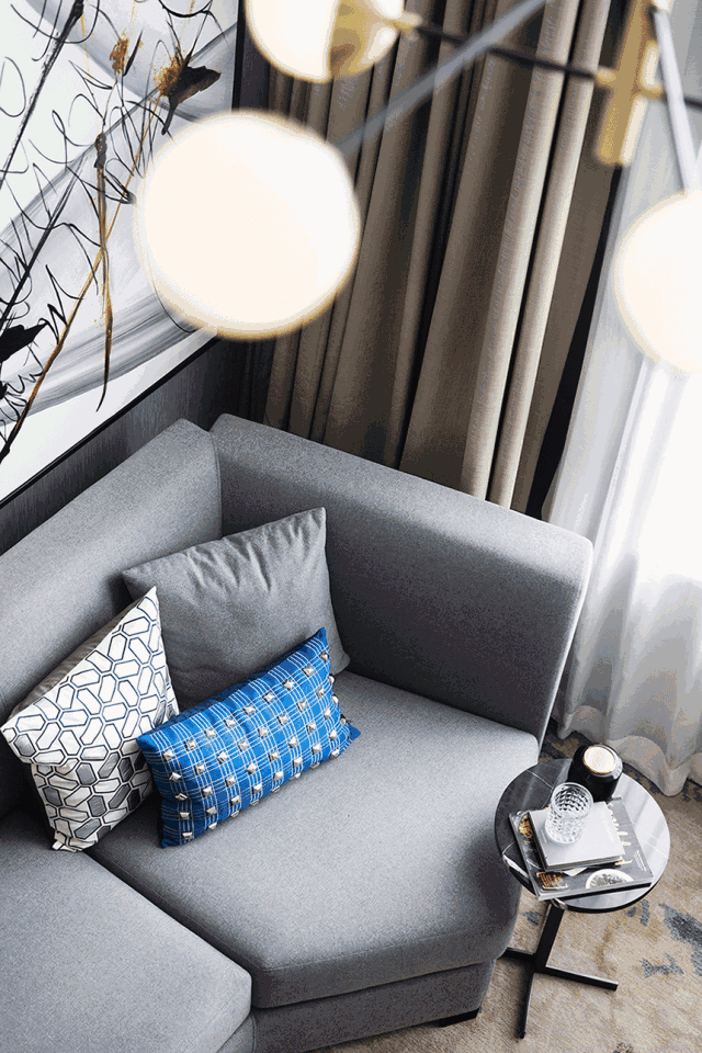 臥室依舊延續主色調的搭配,藍色系的幽靜高雅、灰色調的樸素恬淡,營(yíng)造遠離喧囂的生活氛圍。