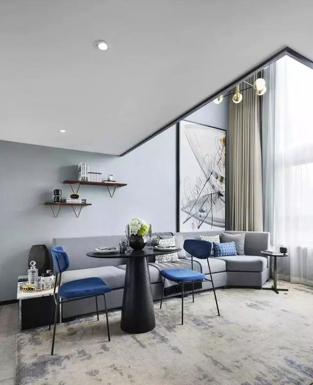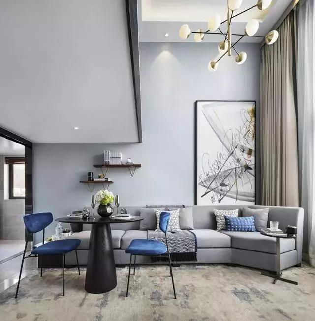 客餐廳拼合成一個(gè)大空間,兩層挑高的落地窗將陽(yáng)光引入,空間流動(dòng)著(zhù)靜謐和諧的氣韻。亮藍色與高級灰家具完美搭配,后現代主義抽象藝術(shù)品、幾何線(xiàn)條的不凡魅力充斥在空間中,呈現一種至臻完美的生活情景。