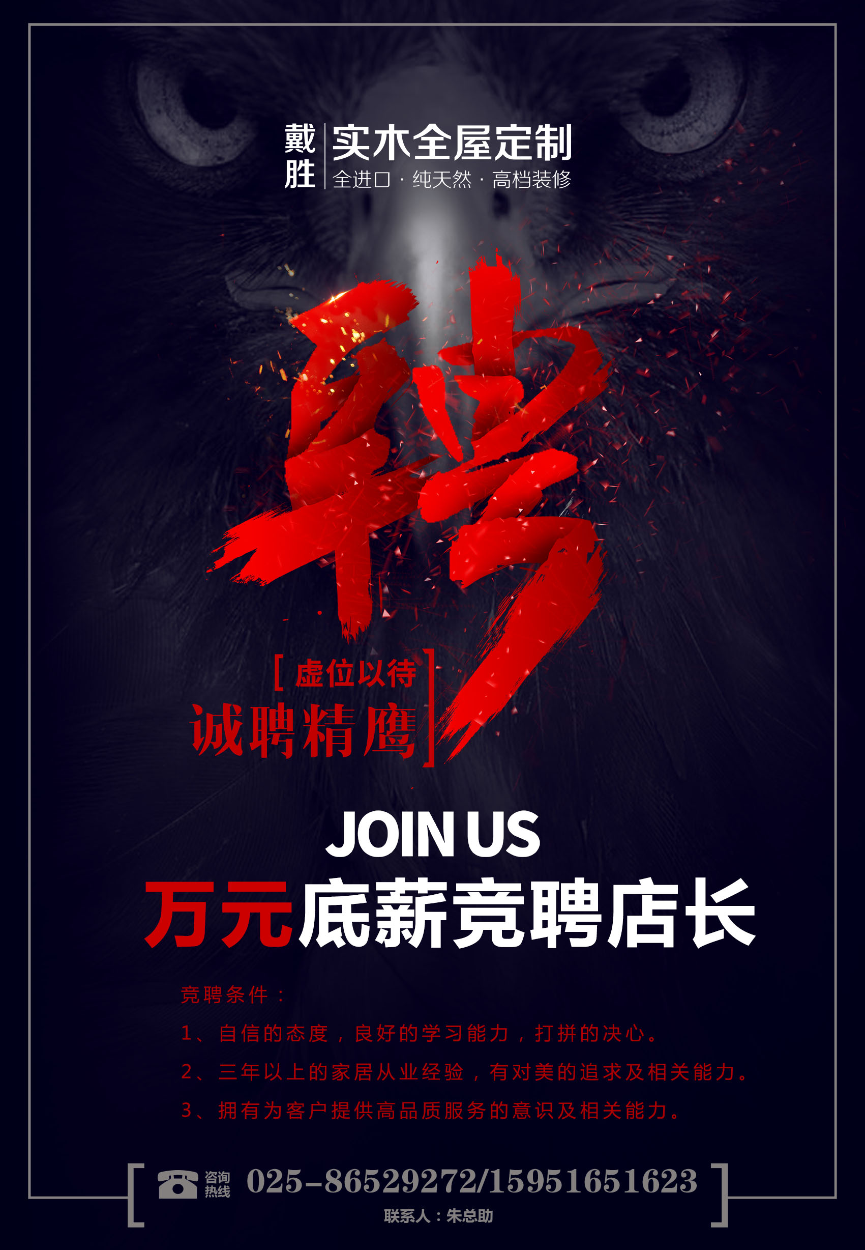 萬(wàn)元底薪競聘店長(cháng)啦! 戴勝實(shí)木全屋定制2018 為自己奮斗,才是最高效的制度。 良好的薪資收入是最好的競爭力。 戴勝實(shí)木全屋定制品牌廣告火力全開(kāi)。 一流產(chǎn)品,全進(jìn)口,純天然,高檔裝修。 一流服務(wù),售后團隊配套十年穩定如一日。 2018戴勝實(shí)木全屋定制全面啟動(dòng)。 南京公司十家直營(yíng)店面,業(yè)務(wù)目前排隊。 ...